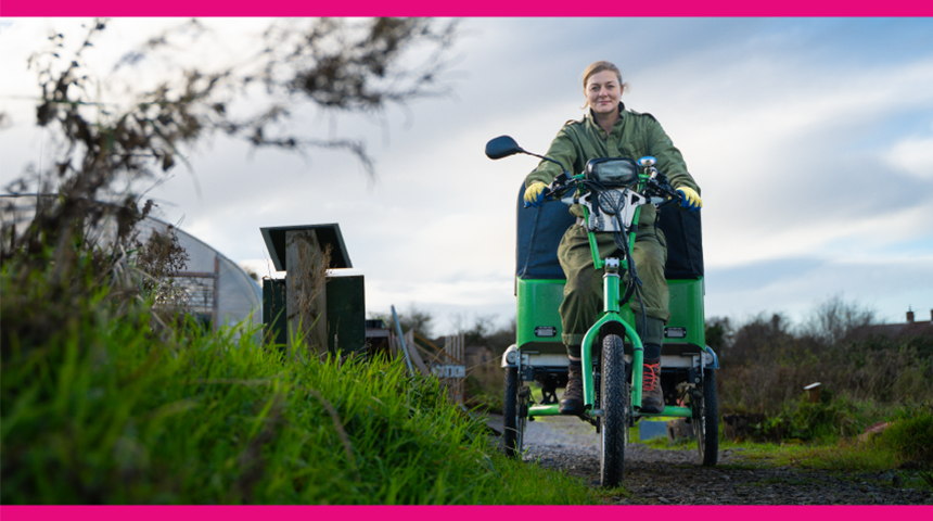 Mae hi’n casglu gwastraff bwyd gan ddefnyddio beic tair olwyn e-Carbon BS13 – golygfa gyfarwydd o amgylch y gymdogaeth. Mae hi’n gweithio gyda dros 60 o gartrefi i’w helpu i wahanu gwastraff bwyd oddi wrth sbwriel cyffredinol. Mae Jen hefyd yn casglu compost gan ysgolion a busnesau lleol. Mae hi’n datblygu cymysgedd compost sy’n perfformio’n dda ac sy’n perfformio’n well na phridd wedi’i brynu o’r siop.